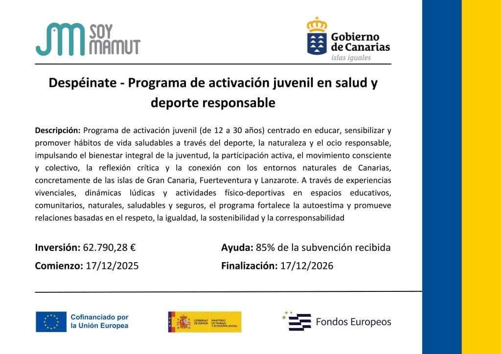 Despéinate – Programa de activación juvenil en salud y deporte responsable es un proyecto subvencionado por la Dirección General de Juventud de la Consejería de Bienestar Social, Igualdad, Juventud, Infancia y Familias del Gobierno de Canarias y cofinanciado por los Fondos Europeos en el marco del nuevo periodo de programación 2021-2027 de los Programas Operativos y Financieros plurianuales del Fondo Social Europeo Plus (FSE+). Esta iniciativa de empleo juvenil se enmarca dentro del Sistema Nacional de Garantía Juvenil Plus del Ministerio de Empleo y Seguridad Social del Gobierno de España.