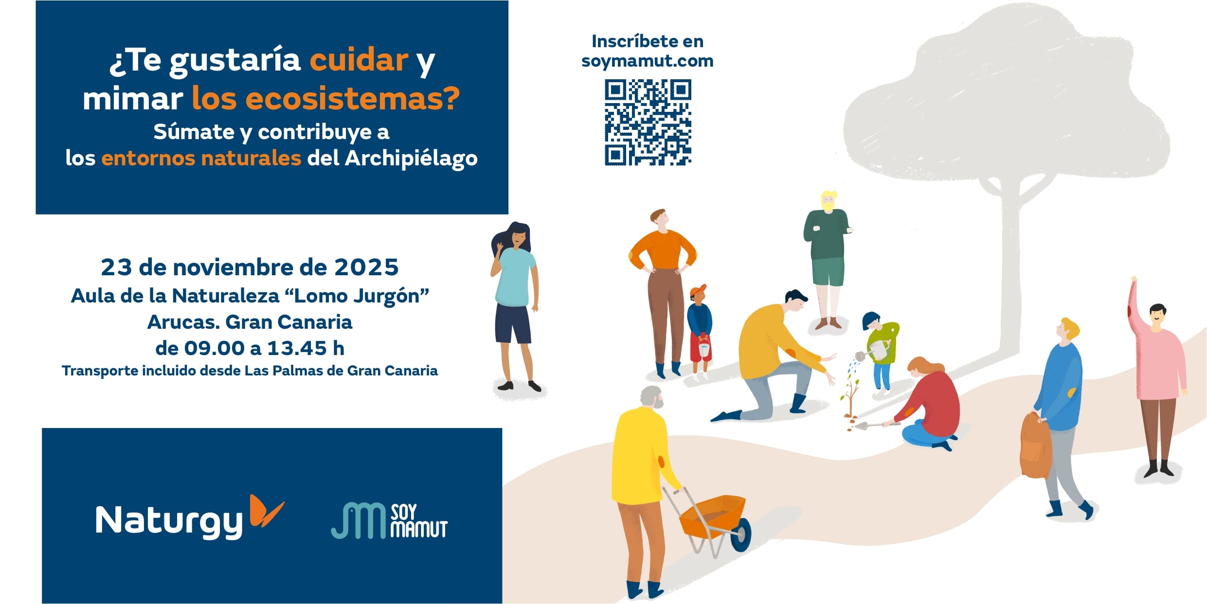 Todas las jornadas son gratuitas y abiertas a trabajadores/as de Naturgy y a la población local de cada isla. Debido a la limitación de plazas, se requiere inscripción previa. Con antelación suficiente, el equipo técnico de Soy Mamut se pondrá en contacto contigo para confirmar si has obtenido PLAZA o quedas en LISTA DE ESPERA. En caso de obtener PLAZA, recibirás por correo electrónico los detalles e información logística (horarios, punto de encuentro, qué necesitas traer, normas y patitas de seguridad…).